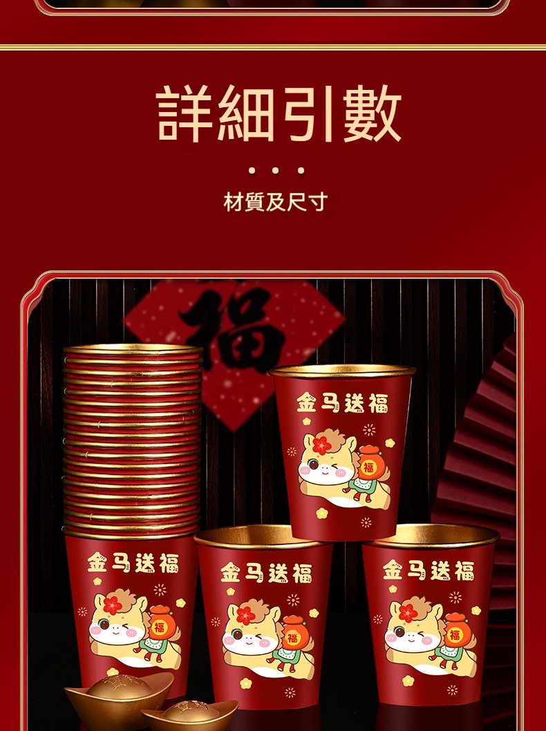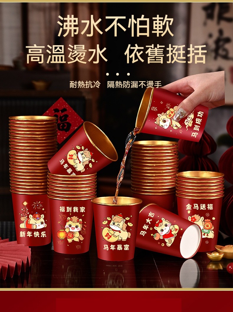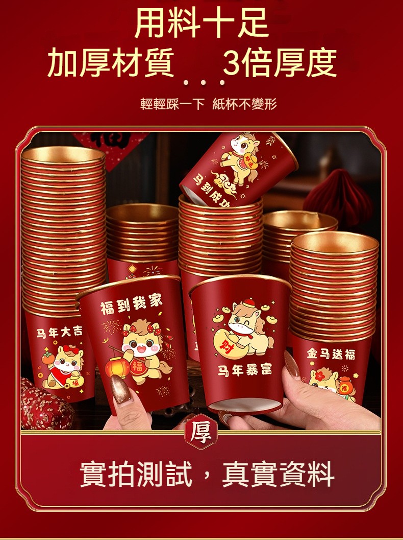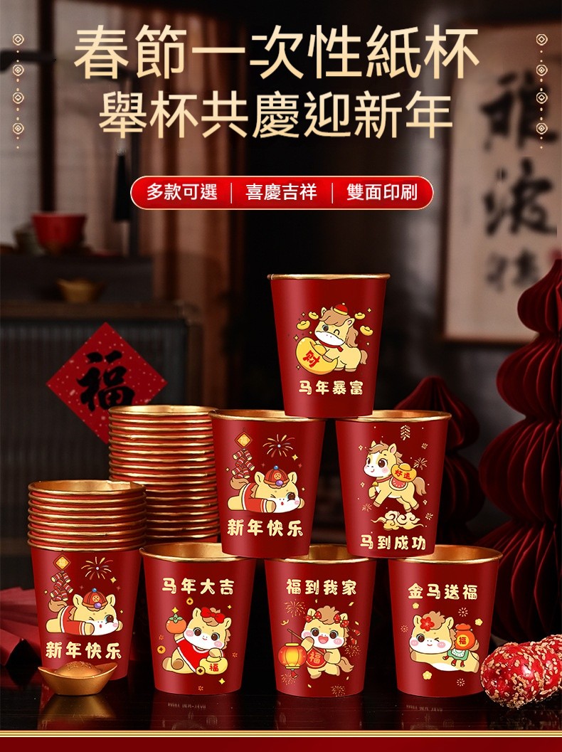 2026馬年開春!這款「新春吉祥紙杯」加厚防漏、燙手不變形,讓團圓飯舉杯共慶更有質感✅ 食品級原生紙漿✅堆疊不易黏杯✅ 多款吉祥話